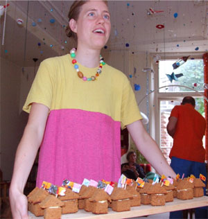 "Nederland is vol." Nog niet zo heel lang geleden was dat een veelbesproken kreet, en we waren verbaasd over de bijval die deze leus ten deel viel. "De wereld is vol." Er zijn mensen en instanties die zich ernstig zorgen maken over de omvang van de wereldbevolking en niet geloven dat er op aarde op de lange duur plaats is voor zes miljard mensen. "Onze agenda's zijn vol." We hebben het druk. Razend druk. Onze hoofden zijn ook vol. Ja, zelfs de ruimte is vol. We denken een vallende ster te zien, maar in feite is het slechts een schilfertje verf van een satelliet dat met duizelingwekkende vaart terugvalt op aarde. Alle brokstukken van satellieten en rakettrappen in een schil om onze aarde heen vormen een toenemend gevaar voor de ruimtevaart. Het is daarom heel plezierig dat Dineke Oosting de moeite heeft genomen om hier in deze woonkamergalerie een nieuw universum te maken. We hebben haar gevraagd hier te exposeren en tot onze vreugde zei ze "ja". Daarmee hebben we er een hele nieuwe wereld bij gekregen. Deze wereld is bewoond. Als je er langer naar kijkt zie je net als in onze wereld verwante groeperingen. Allochtoon, autochtoon, wezens die van elkaar verschillen en die op elkaar lijken. Raketten, radiobakens, grillige asteroïden. Zelfs de singles zijn erbij in de vorm van autonome, solitair levende ruimtewezens. Als je er langer naar kijkt valt de stilte op. Zit je hier 's avonds alleen in de kamer dan verwacht je van tussen die draden iets van de harmonie der sferen te horen. De muziek van de planeten. Eigenlijk zou er een moeten beginnen te seinen, op zoek naar contact met een andere beschaving. In die verstilling groeit langzaam het besef dat wat je ziet heel vertrouwd is. Dit zijn wij zelf, net terug van de camping. Dit zijn onze plastic koffiefilters, onze eierdozen en sapkannen. En ook de kleuren zijn van ons. Dit is het oranjelegioen met de rood wit blauwe vlag. Het vreemde waar we naar kijken, dat zijn wij zelf.