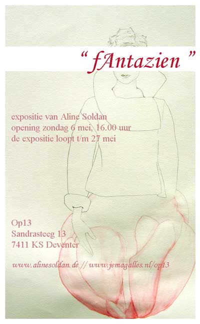Wat zie je? Gewoon een willekeurige bloem, of een zachte klaproos? Als mens geef je zelf de dingen die je ziet een betekenis. De fantasiefiguren van Aline Soldan komen geleidelijk aan tot leven. Tijdens het maken krijgen ze hun karakter en ook hun naam. Aline zegt: "Ze laten zich aan me zien. Ze groeien aan mij en ik door hen." Voor de toeschouwer is de expositie een spel van begrip en misverstand. Als je meegaat in de fantasieën komt ook je eigen fantasie weer tot leven. In de serie Springplank 2007 exposeert Aline Soldan (Berge - D, 1980) als vierde in de projectruimte Op13 aan de Sandrasteeg in Deventer. Aline maakt ruimtelijk werk en tekeningen. Na een eerdere opleiding als bouwtekenaar studeerde ze in 2006 af aan de AKI, afdeling beeldhouwen. Vanaf 6 mei tot en met 27 mei is het werk te bezichtigen. Op13 is geopend van vrijdag t/m zondag van 13.00 tot 17.00 uur, en op afspraak.