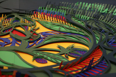 Het werk van Ayuk Kuperus voegt een nieuwe artistieke dimensie toe aan de traditionele papier-knipkunst. In haar werk gaan sierlijke decoratieve vormen samen met chaotische en dramatische effecten. Ayuk snijdt sierlijke vormen en patronen uit grote vellen papier om er vervolgens zeer gedetailleerde, monumentale kunstwerken van te maken. Ayuk drukt het zelf zo uit: "Ik koppel mijn fascinatie voor de complexiteit en de eenvoud van papier aan mijn fascinatie voor de wereld van licht waar zo makkelijk aan voorbij wordt gegaan. Uiteindelijk komt alles samen in de lijn die ik wegsnijd, de lijn die overblijft, de lijn van het licht, en de lijn van het fysieke papier. Ik zie mijn werk graag als een stimulans voor anderen om er iets in te vinden dat als uitgangspunt gebruikt kan worden voor hun eigen ontdekkingsreis". Ayuk won in 2004 de Overijsselse Junior Beeldende Kunstprijs. Haar werk was onder andere te zien in CODA Apeldoorn, bij Kunstvereniging Diepenheim en in Kunstenlab Deventer. In 2006 nam ze deel aan de Holland Papier Biënnale. Op zondag 25 november 16.00 uur wordt de expositie feestelijk geopend. De installatie is vanaf de straat in Op13 te zien van 25 november tot en met 23 december. Voor bezichtiging binnen kan je telefonisch een afspraak maken.